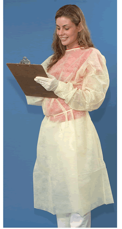 2). Spun Bond Polypropylene, Yellow, Elastic Wrists, Tie on Neck and Waist, Universal Fit, 10/bg, 5bg/cs