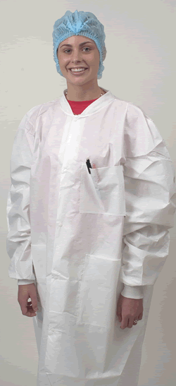 3). Lab Coats, Micro-Porously SF Barrier Material, White, 1XL to 3XL, Snap Front, Knit Cuffs & Collar, Knee Length, Breathable, 3pkt, 60gsm, 30/cs